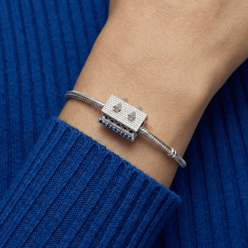 Crafted in sterling silver, this bead is shaped like the iconic Frankenmuth Holz Brücke Covered Bridge. A row of deep blue cubic zirconia gemstones...