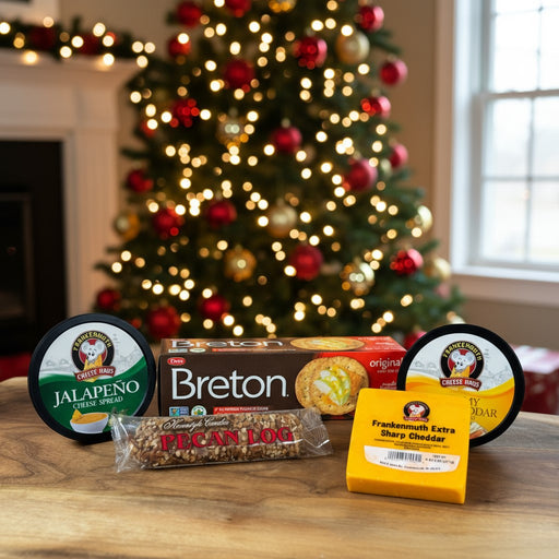 Turn up the cheer with creamy spreads, a bold cheddar, and crisp crackers—finished with a sweet, nutty pecan log. A little heat, a little tang, a l...